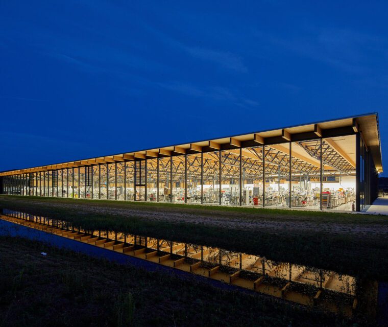 Opened in 2020, the 17th French leather goods workshop of the Société des Ateliers Louis Vuitton develops an original design. The town of Saint‐Pourçain‐sur‐Sioule is located in the center of Allier, halfway of Moulins, Vichy and Montluçon. The land belongs to the landscape agricultural sector of Northern Limagne Bourbonnaise. The 6,400 m² workshop develops a reproducible concept, where its performances, constructive, operational responses to a need for increased agility in the industry. It is a heritage project