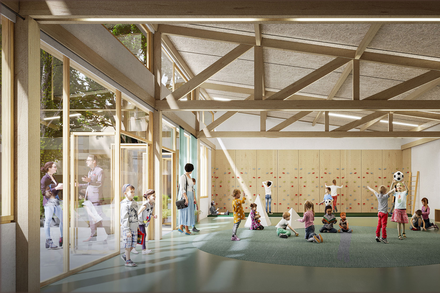 Le projet réhabilite les deux bâtiments existants centraux et complète son fonctionnement par une nouvelle aile en alignement sur la rue Georges Guynemer ainsi qu’une aile dédiée aux programmes Passerelle et motricité.