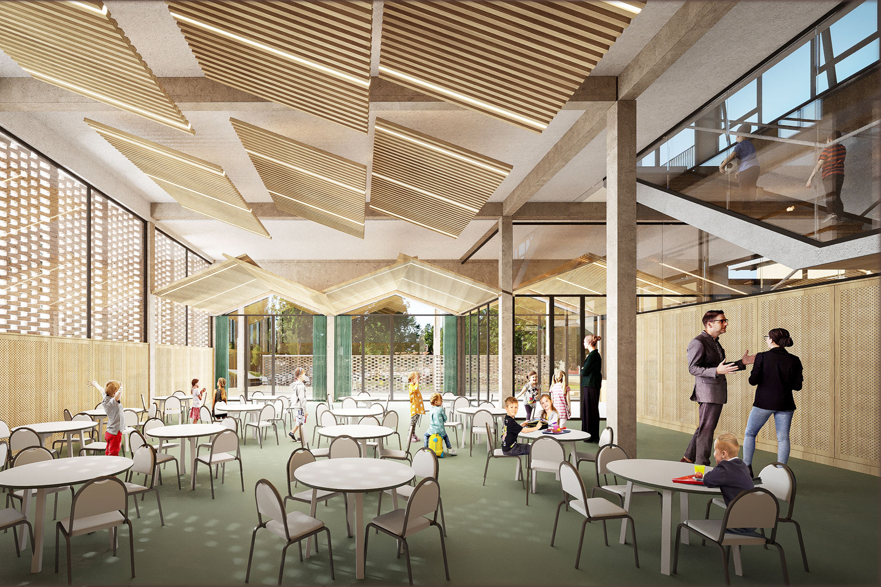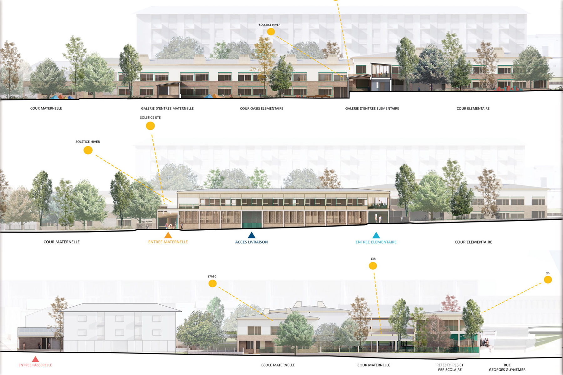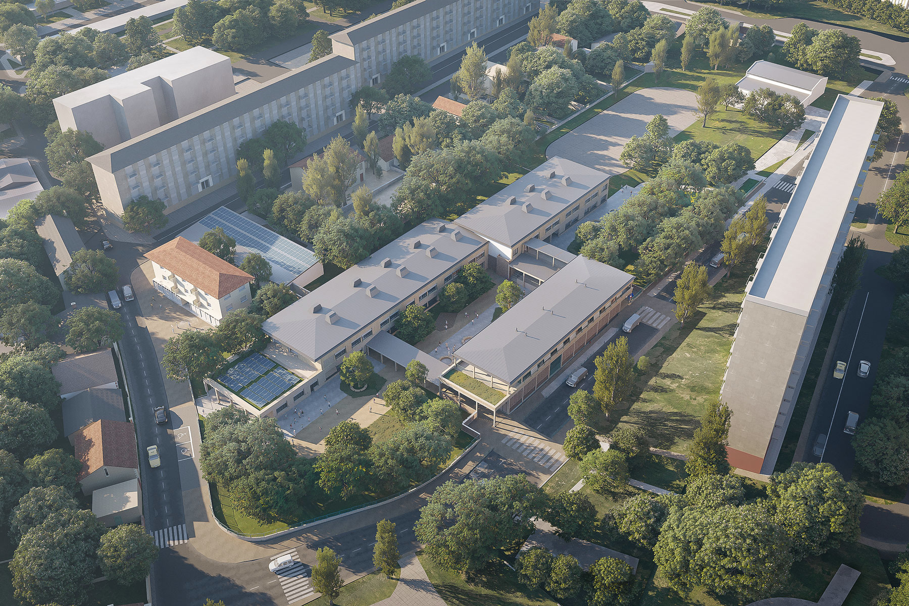 Le nouveau bâtiment implanté sur la rue Georges Guynemer, affirme la présence de l’école et requalifie la rue. Il offre une façade identifiable et organise les accès principaux : maternelle au Sud, élémentaire au Nord. Il abrite les pôles restauration en RDC, le périscolaire et la salle polyvalente à l’étage. Par sa volumétrie simple et unitaire, il incarne l’institution et par son péristyle régulier, offre une image accueillante, contemporaine et animée du groupe scolaire.