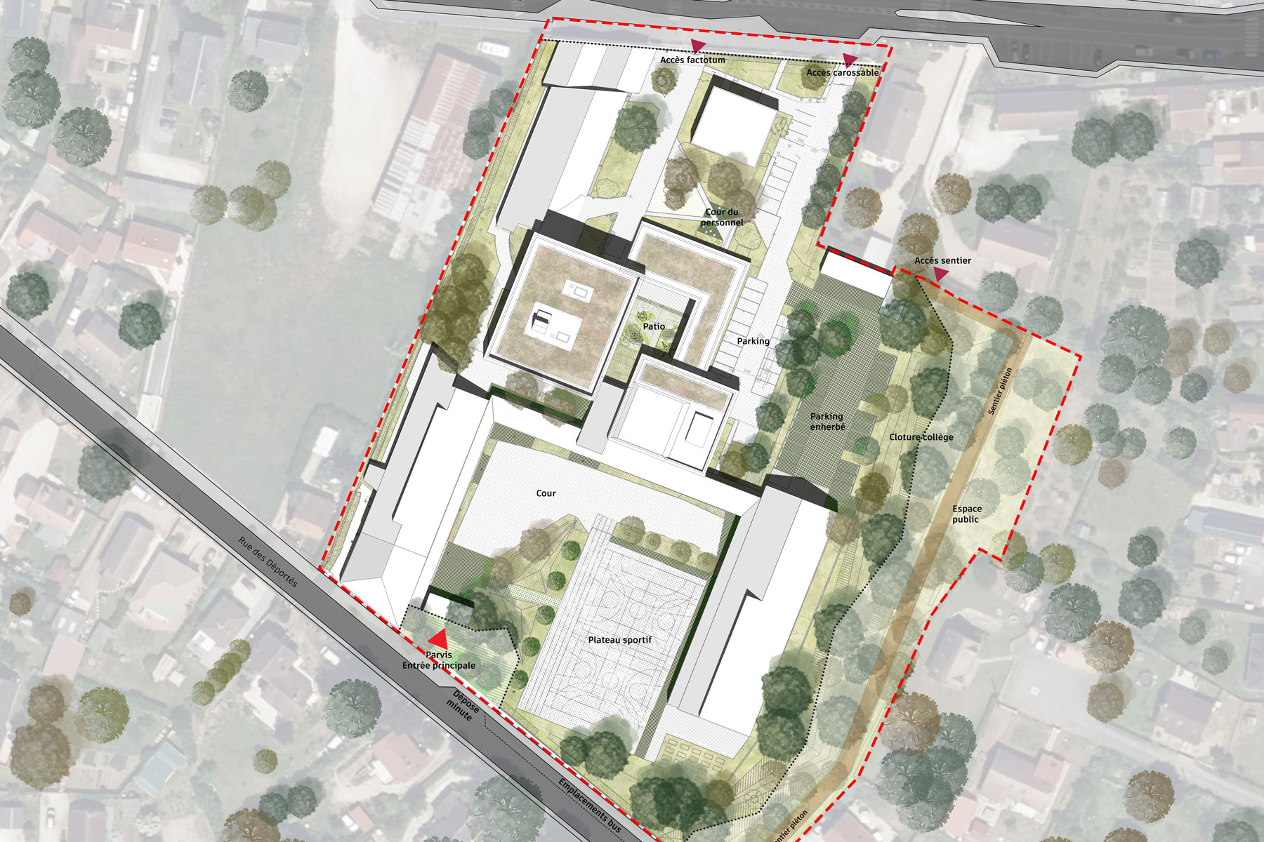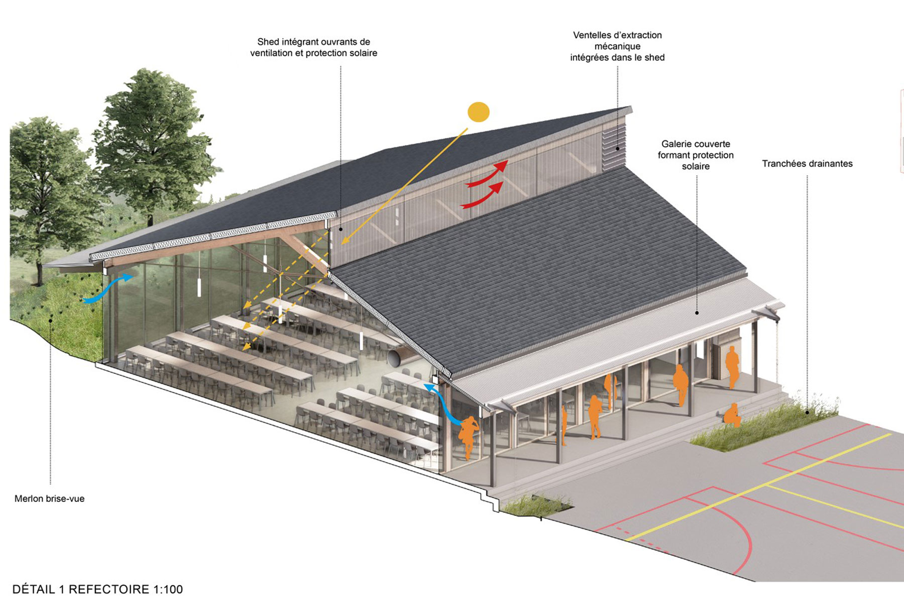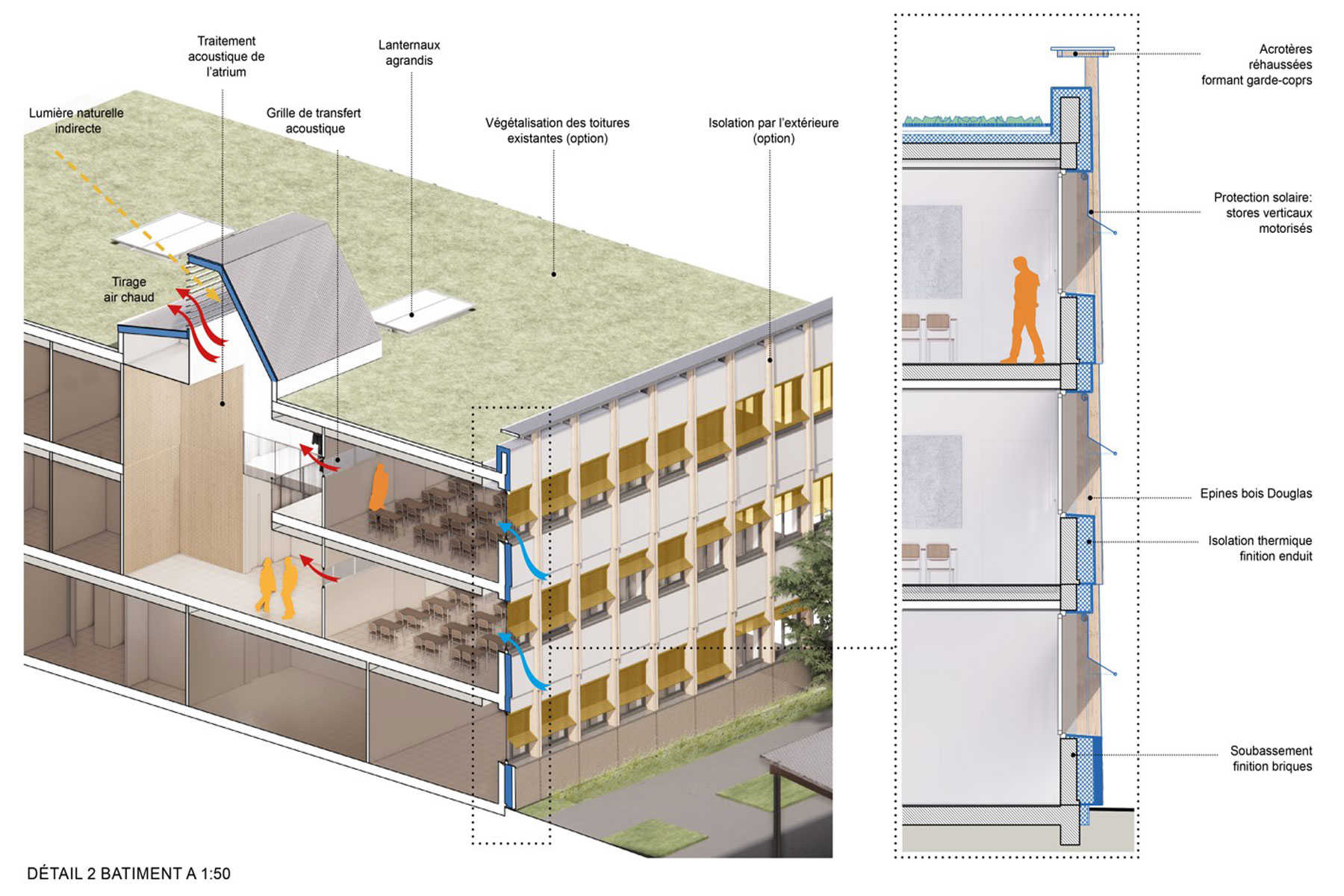 Le projet est une synthèse entre le « scénario projeté », le phasage en site occupé et l’enveloppe financière. Cette synthèse se croise avec une « stratégie opératoire » garantissant les objectifs architecturaux pour la fabrication du projet, et une forte intention environnementale, paysagère, cohérente et ambitieuse